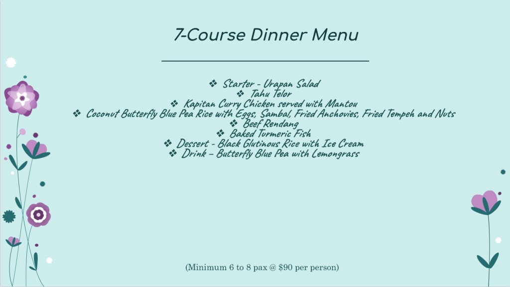 7-Course Dinner @ $90.00 p.p. & 5-Course Dinner @ $73 p.p. Payment to be made in advance via PayNow.