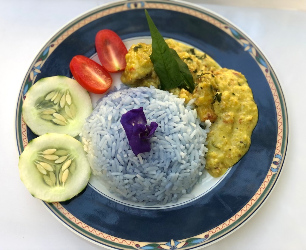 Nyonya Blue Pea Coconut Rice with Kapitan Chicken Curry $15